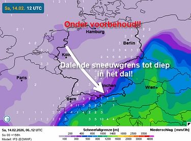 Kijken we nog iets verder richting het weekend van de Voorjaarsvakantie ziet er tot nu toe prima uit. Een koufront duikt vanuit het noordwesten ouderwets boven op de Oostenrijkse noordzijde. Het is nog afwachten hoe het zich precies gaat ontwikkelen, maar dit signaal staat toch al een aantal dagen pontificaal in de weerkaarten. Dit duidt op een bepaalde mate van betrouwbaarheid. De sneeuwgrens daalt tegen die tijd tot ruim onder de 1000 meter. Dit zou toch fantastisch zijn voor het tot nu toe zo geplaagde Oostenrijk. Precies op het 1e weekend van de Voorjaarsvakantie sneeuwbuien tot onder het 1000 meter niveau.