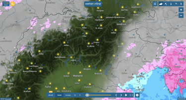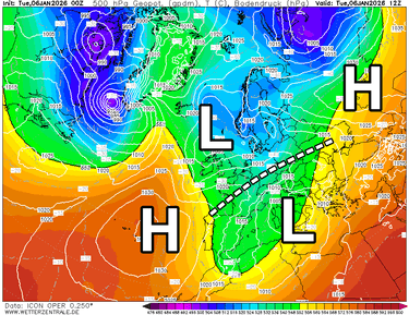 Geknepen tussen een hogedrukgebied bij de Azoren en boven Rusland zorgt een zwakke hogedrukconnectie ervoor dat het ook vandaag nog droog blijft in de Alpen. Het is straf om te zien hoe tot nu toe quasi alle neerslagzones en buiengebieden in een boog om de Alpen trokken. De aanwezige lucht is wel ijzig koud met op 1500 m -5 tot -10°C. Komende dagen ontwikkelen er boven de Atlantische Oceaan wel afscheurende lagedrukgebieden op de grens van verschillende luchtmassa's. Deze zullen vanaf donderdag voor een overgang naar een wisselvallig, maar ook zachter, weertype zorgen.