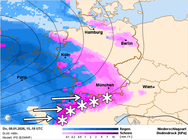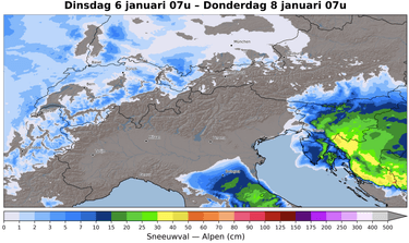 Tijdens de nacht op donderdag schuift er vanaf het westen dan wat lichte neerslag (sneeuw) het Alpenruim binnen. Via de noordkant verplaatst deze neerslag zich naar Oostenrijk, maar veel meer dan 0-2 cm valt er niet. Aan de zuidkant blijft het droog. Donderdag richt een aanspannende westenwind zijn pijlen op de Alpen. Een warmtefront nadert in sneltempo de bergen en tijdens de voormiddag ontstaat er neerslag in de Franse Alpen. Donderdagnamiddag duwt de wind de neerslag langs de noordkant naar het oosten. De sneeuwgrens ligt eerst helemaal onderin, maar stijgt met het binnenstromen van wat mildere lucht dan tot 1000-1400 m. In de Oostelijke Alpen zal het tot de avond duren vooraleer de neerslag aankomt, met eerst nog brede opklaringen. Langs de zuidkant blijft het donderdag vrijwel droog. Dicht tegen de hoofdkam is overgrijpende neerslag mogelijk, maar wat verder weg van de hoofdkam blijft het droog. Cumulatief verwacht ik bij deze fase 20-40 cm in het westen en noordwesten en 10-20 cm sneeuw elders langs de noordkant. Vrijdag volgt een nieuwe portie sneeuwbuien voor de Franse en West-Zwitserse Alpen. Hier daalt de sneeuwgrens ook weer tot 500-600 m. In Oostenrijk en langs de zuidkant blijft het dan droger met opklaringen. Meer van dat op zaterdag. De wisseldag wordt zeer wisselvallig met langsheen de hele noordkant sneeuw tot onderin. Mogelijk zorgt dat voor zeer moeizame reizen, al is het natuurlijk nog ver. De zuidkant houdt het ook zaterdag droog. Zondag lijkt de stuwing (Nordstau) zich vooral op het oosten van Zwitserland en Oostenrijk te focussen met daar mogelijk veel sneeuw. Een sneeuwfase lijkt zich aan te dienen aan de west- en noordkant, en daar zijn de skigebieden zeker blij mee.