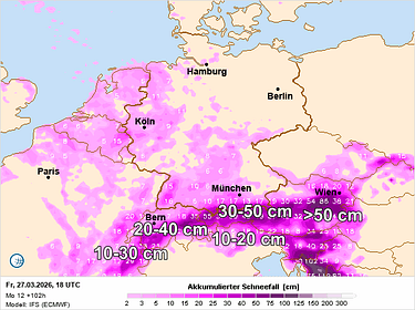 Tijdens de nacht op donderdag zorgt de opstuwing van steeds koudere lucht tegen de noordkant voor langdurige sneeuwval. De sneeuwgrens ligt daarbij laag, rond 200-400 m. Het overgrijpen van koudere lucht zorgt voor de vorming van een klein lagedrukgebied boven Italië waardoor er ook in het zuidoosten van de Alpen sneeuw ontstaat. Donderdag overdag blijft het langs de hele noordkant betrokken met sneeuw van betekenis tot onderin. Aan de zuidkant blijft het dan droger met opklaringen. Tijdens de nacht op vrijdag wordt het in het westen droger, maar in Oostenrijk kan nog langdurig sneeuw vallen langs de noordkant. Vrijdag overdag wordt het dan wel droger, met vanaf het westen stilaan meer zon. Vanaf het noordoosten wordt er dan wel steevast koude, polaire lucht aangevoerd en door een forse wind voelt het extra koud aan. Een winterprik van betekenis! Tot en met vrijdag kan er in de Oostelijke Alpen langs de noordkant vlot 50 cm sneeuw vallen, in het westen is dan 20-30 cm, langs de oostelijke zuidkant 10-20 cm.