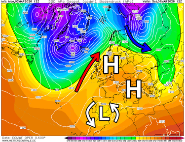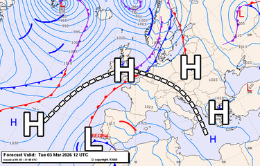 Lagedruk ligt ten zuidwesten van Spanje. Ten noorden daarvan zorgt een sterke hogedrukrug voor rustig voorjaarsweer in een groot deel van Europa. Zo ook in de Alpen. De aangevoerde lucht komt uit het noorden van Afrika en is daardoor weer wat zachter. De vorstgrens gaat dan ook de hoogte in, en dat zullen we vooral in het westen merken.
