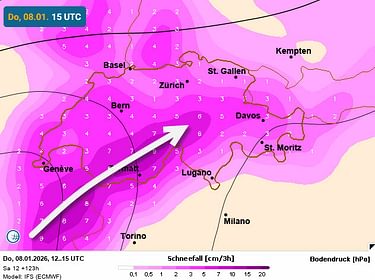 Nog iets verder speurend staat de sneeuwdoorbraak voor de Franse Alpen rond 8 januari nog steeds op het programma. Een actieve storing koerst tegen die tijd via de Zuidelijke Noordzee oostwaarts. Het bijbehorend front klapt volgens ECMWF frontaal op de Franse Alpen. Zwitserland en Oostenrijk krijgen dan ook met sneeuwval te maken, maar minder dan Frankrijk. De sneeuwgrens is nog wel een belangrijk aandachtspunt. Deze schommelt volgens de laatste berekeningen ergens tussen de 1400 en 1700 meter. Maar dit kunnen de over het algemeen wat hoger liggende Franse wintersport locaties makkelijk hebben.