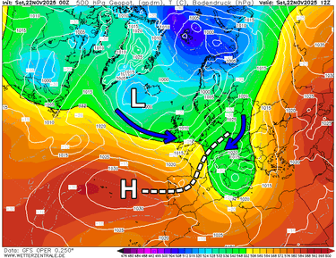 Een uitloper van hogedruk (meer dan 1025 hPa) zorgt vandaag voor rustig weer in de Alpen. Neerslagzones blijven eventjes op verdere afstand. De weersverbetering is wel kortstondig. Morgen trekt een lagedrukgebied over de Britse Eilanden naar de Noordzee. Bijhorende fronten schuiven zich aan de zuidkant van dit laag naar de Alpen en leveren daar weer neerslag (sneeuw!) van betekenis op. Voorlopig blijft het wat koeler dan het langjarig gemiddelde voor de tijd van het jaar.