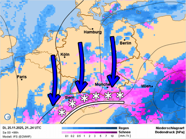 Maandag blijven de Westelijke en Noordelijke Alpen aan de zuidkant van een lagedrukgebied boven de Noordzee in de vuurlinie liggen van een westcirculatie met neerslag. De sneeuwgrens ligt hierbij rond 1600 m in het westen en 1000 m in het noorden. Lager dan deze hoogte zal regen de sneeuw van de voorbije dagen doen wegsmelten. In de Dolomieten is ook wat neerslag mogelijk (overglijdend), maar veel stelt dit wellicht niet voor. Elders blijft het aan de zuidkant droog met opklaringen. Dinsdag schuift het lagedrukgebied op naar het oosten. De wind in de Alpen draait dan opnieuw naar het noorden. Ik verwacht op dinsdag en woensdag daardoor langs de hele noordzijde weer sneeuw van betekenis tot lage hoogte. Het winterse weertype geeft zich duidelijk niet zomaar gewonnen! Deze periode houdt de zuidkant het in de schaduw van de Alpen droog en zonniger. Fijne dag :)