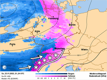 Gisteren viel er in de Noordelijke en Oostelijke Alpen langdurig sneeuw van betekenis. Op sommige plaatsen werd cumulatief 40 cm sneeuw gemeten. Bovendien was het wellicht de koudste dag van de winterperiode tot nu toe. En afgelopen nacht heeft deze koude lucht zich nog doorgezet. Op Zugspitze is het vanmorgen -20°C! IJzig koud dus, en er is meer sneeuw op komst. De sneeuwgrens zal wel stijgen, maar dat is helemaal normaal. Het is nog maar 22 november! De winter moet nog beginnen.