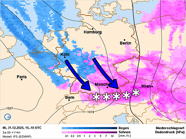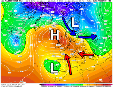 Begin volgende week zakt het Scandinavisch lagedrukgebied steeds verder naar het zuidoosten. Hierbij rukt polair-arctische lucht langs de westflank verder op naar Centraal-Europa. Eerst is Oostenrijk aan de beurt om in de koude luchtmassa's terecht te komen, nadien Zwitserland en Frankrijk en uiteindelijk ook Italië. Maandag blijft het nog zonnig en droog, met misschien stilaan wel wat hoge wolken in Oostenrijk. Dinsdag betrekt het in Oostenrijk langs de noordkant en kan er een beetje sneeuw vallen (tot onderin). Elders in de Alpen blijft het ook dan nog zonnig. Woensdag nemen de sneeuwkansen in Oostenrijk verder toe. Of er echt veel sneeuw gaat vallen betwijfel ik, maar elke centimeter is nu mooi meegenomen. Meer naar het westen blijft het wellicht tot vrijdag droog, met vanaf dan ook elders langs de noordkant stijgende neerslagkansen. Voor Italië zien de weerkaarten er volgende week droog en zonnig uit. Op de lange termijn lijkt het winters te blijven. Het ziet er naar uit dat we toch een markant koelere periode in de winter tegemoetgaan. Fijne dag. Morgen is Michael er weer :)