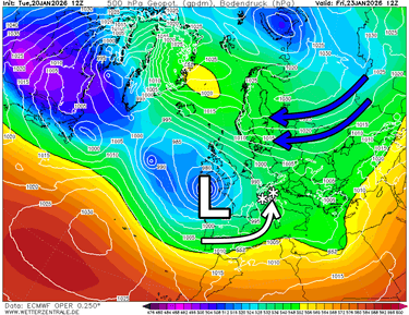 Vrijdag draait de wind naar Z-ZW en neemt de windkracht ook doordat de isobaren dichterbij elkaar komen staan. Aan de zuidkant en ook in het westen betrekt het daardoor al snel, gevolgd door het ontstaan van stuwingsneerslag: sudstau! Aan de noordkant blijft het droog met hoge wolkenvelden (die overwaaien) en föhn-opklaringen. De sneeuwgrens ligt tussen 600-1000 m, lokaal bij intense neerslag nog wat lager. In de nacht van vrijdag op zaterdag trekt de neerslag van ZW naar NO door over de Alpen en wordt het aan de achterzijde daarvan droger. Dat is ook het moment dat er aan de noordkant eveneens een beetje sneeuw kan vallen. Cumulatief verwacht ik tegen zaterdag 20-30 cm langs de centrale zuidkant, 5-10 cm langs de westelijke en oostelijke zuidkant, 10-20 cm in de Westelijke Alpen, en 1-5 cm langs de noordkant. Deze hoeveelheden kunnen komende dagen nog wel wat wijzigen. Een volgende neerslagfase dient zich zondag alweer aan met dan weerom neerslag vooral voor de Italiaanse kant van de Alpen (sneeuwgrens onder 1000 m). Begin volgende week schuift de lagedruk dan verder door naar het oosten aan de zuidkant van de Alpen en zou er mogelijk een portie koude lucht vanaf het noordoosten naar de Alpen stromen. Zodra deze op de Alpen botst zou er tijdelijk een nordstau kunnen ontstaan. We volgen het de komende dagen verder op, maar de sneeuwkansen zijn wel degelijk aanwezig! Eerst vandaag maar weer genieten van het zonnige weer in de bergen :)