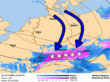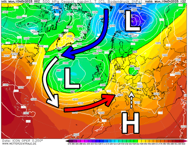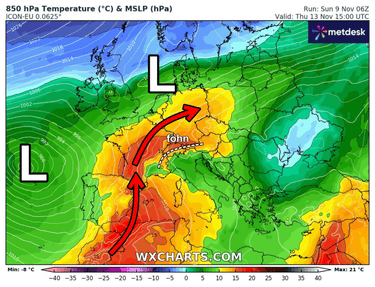 Vanaf zaterdag wordt het dan interessant. Hogedruk positioneert zicht tussen IJsland en Schotland. Ten oosten daarvan is ruimte voor een lagedruktrog (boven Scandinavië). Tussen beide in ontstaat er een noordelijke luchtstroming die Arctische lucht naar Europa pompt. De vraag wordt hoe ver de koude lucht kan komen. Daar deze gisteren eenvoudig over Centraal-Europa kon uitstromen lijkt het nu kantje boordje te worden. Zaterdag zou een koufront aan de voorzijde wel al sneeuw kunnen opleveren. Misschien moeten we voorlopig maar niet verder kijken dan dat, gezien de grote onzekerheid. Fijne dag!