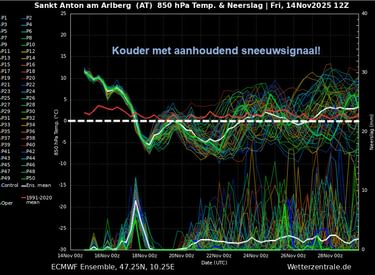 Er komt geleidelijk wat meer duidelijkheid in de weerkaarten. Natuurlijk zijn er nog wel wat verschillen in uitkomst. Maar de trend is duidelijk kouder. Hier durf ik mijn handen spreekwoordelijk al voor in het vuur te steken. Maar hoe zit het met de sneeuw hoor ik jullie denken. Die komt er ook. En doordat de koudere periode hoogstwaarschijnlijk wat langer aanhoudt gaan de sneeuwkanonnen volgende week over de gehele breedte aan. Daar weten de locals wel raad mee. Volgende week staat voor veel gebieden in het teken van het voorzichtig aanleggen van een eerste solide basislaag. Dat klinkt ons wintersportliefhebbers als muziek in de oren!