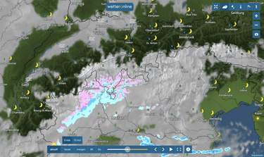 Langs de noordkant hangt er vanochtend hochnebel met een bovengrens rond 800-900 meter. Daarboven is het zonnig weer met wat middelhoge wolkensluiers die hier en daar voorbijtrekken. Overdag lost dit maar geleidelijk op. Erboven is het de hele dag zonnig en droog, met stilaan nog wat helderdere (drogere) lucht. Aan de zuidkant van de Alpen is er duidelijk meer lage bewolking aanwezig vanochtend. In de oostelijke regio's (bijvoorbeeld Dolomieten) breekt de zon overdag wel door, maar in het noordwesten van Italië blijft het de hele dag betrokken. Een zwakke Retour d'Est zorgt hier ook voor wat lichte stuwingsneerslag. De sneeuwgrens ligt helemaal onderin. Ten zuiden van de hoofdkam vriest het rond 800 m in het westen en 1400 m in het oosten. Aan de noordkant is het duidelijk wat zachter met een vorstgrens rond 2000-2200 m. De wind waait matig uit Z-ZO. Langs de hoofdkam komen soms nog föhn-rukwinden voor tot 60-70 km/u.